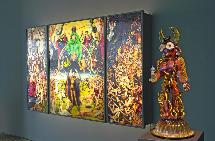 Freely splicing together Mexican folk art, corporate logos, religious icons, and masked wrestlers, the brothers de la Torre use the extraordinary ability of glass to take on almost any color or shape to populate their cross-cultural artistic universe of characters and symbols that flaunt traditional hierarchies in the service of an irreverent take on the dizzying experience of living between the contrasting image-saturated cultures of México and the U.S.